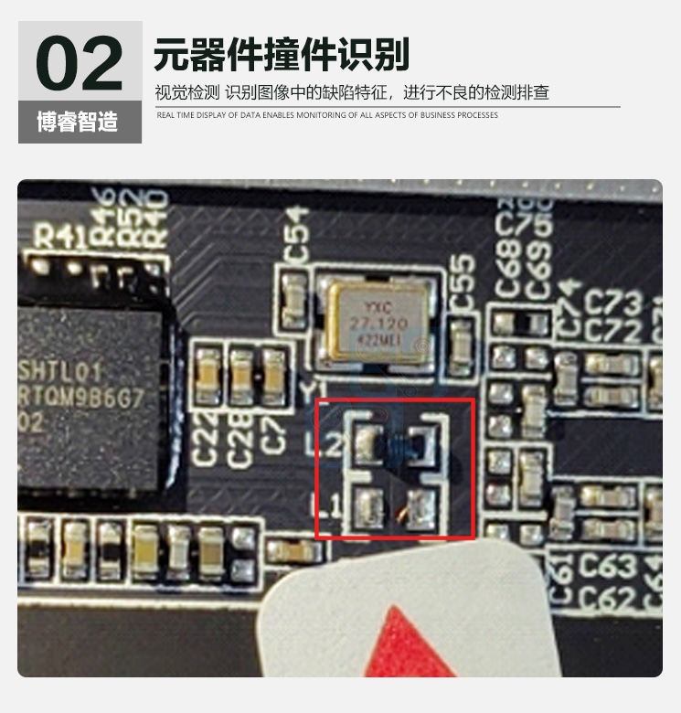 1、显卡底板颜色与元器件相似,低颜色对比度情况下,仍能识别和判断元器件的错漏反及撞件。 2、可测元件尺寸为0201/01005,对精度及视觉算法的要求很高。 3、产品尺寸最小4cm2都不可能实现1帧采集完图像,图像采集与拼接处理对视觉算法要求高。