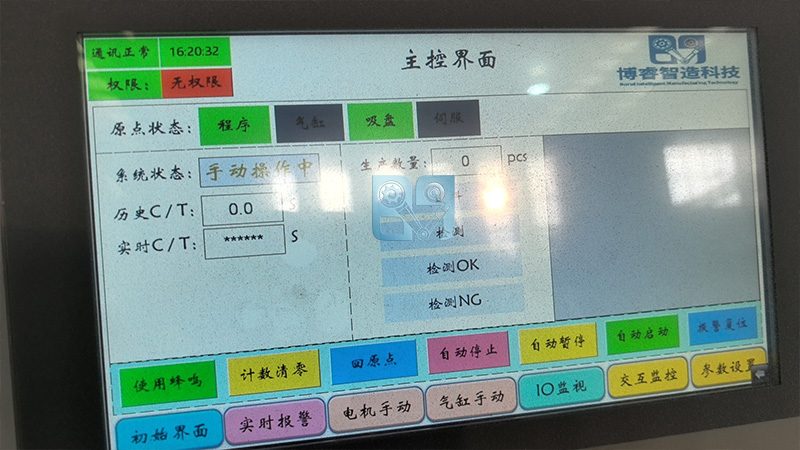 1.产品在输送线上走到位后,传感器感应产品 2.工人进行盒盖,操作完后按启动进入检测环节 3.XYZ轴走位到检测位置,相机气缸下降,相机拍照检测,拍照完成移动至下一检测位置 4.检测完成后OK产品则自动流走,NG则报警