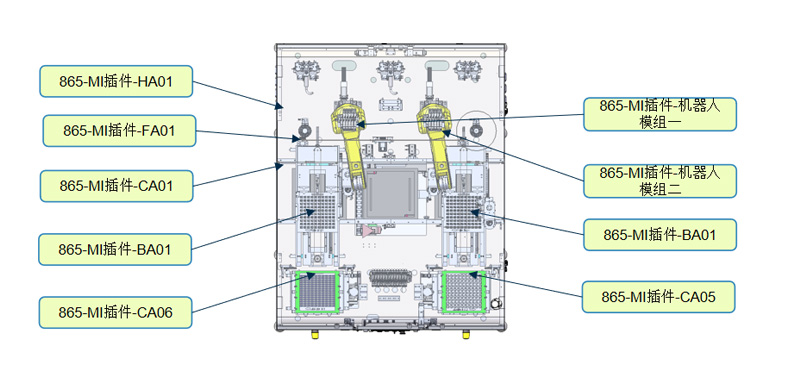 1:升降模组上物料托盘拉出被定为好 2:机器人模组一 移动到物料夹取位上方 3:滑台气缸一伸出,夹爪气缸一夹取物料 4:滑台气缸缩回 5:机器人模组移动到取第二个物料上方 6:滑台气缸二伸出,夹爪气缸二夹取物料 7:滑台气缸二缩回 8:机器人移动到端子检测模组上方 9:端子检测视觉对夹取的物料进行检测 10:OK的就等待插件,(等待机器人二插件完成)NG的就排除,重新回到取料位上方执行2 或5